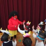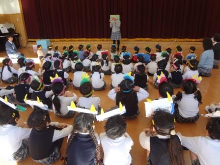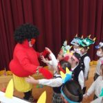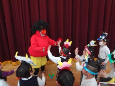 豆まきの歌ををうたったり、節分の由来のお話を聞いていると赤鬼が登場!