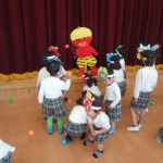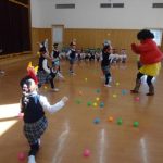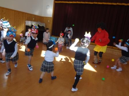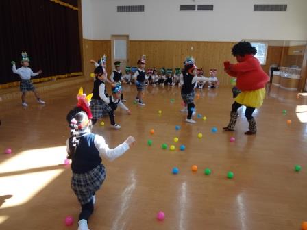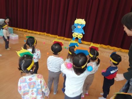 ビックリした子どもたちは、「おにはーそと!」と一生懸命ボールを投げていましたが、