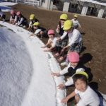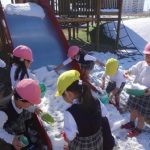 大人には少し厄介な雪ですが、白く染まった砂場や滑り台、ブランコに大喜びの子どもたち。