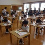鉛筆の持ち方、書き方や書き順等を確認しながら真剣に取り組む子どもたち。